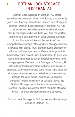 Dothan Lock Storage in Dothan, AL offers surveillance cameras, video monitoring and security gates and fencing. Affordable, secure self storage in Dothan. Dothan Lock Storage in Dothan, AL has courteous and knowledgeable on-site storage facility managers who will help you find the perfect self storage solution within your budget. Dothan Lock Storage will knock the socks off our competitions storage rates and our storage service is always first class. Trust Dothan Lock Storage for all your self storage needs. Every storage unit is backed by our Lowest Price Guarantee, to help you save time and money when shopping for the right storage space. Dothan Lock Storage in Dothan, AL also offers flexible payment options, and move-in specials, extended storage gate hours, and superior storage customer service. Whether youre seeking storage for your home, business, relocation, personal needs, a military or college move, the Dothan Storage consultants are here to help. Dothan Storage in Dothan offers the best storage units all your storage needs are covered.